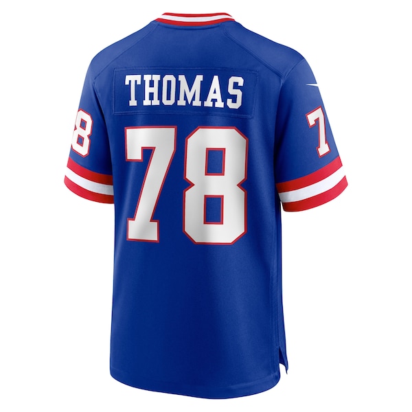 Show off your excitement for the throwback-inspired New York Giants uniform with this Andrew Thomas Classic Player Game Jersey. This Nike jersey features red-and-white stripes on the sleeves and collar and red trim around the numbers that replicate the design worn by the team during the 80s and 90s. including the seasons of their first two Super Bowl championships. The mesh side panels provide extra breathability. and the inside neckline boasts the spirited phrase. ''Once A Giant. Always A Giant.''