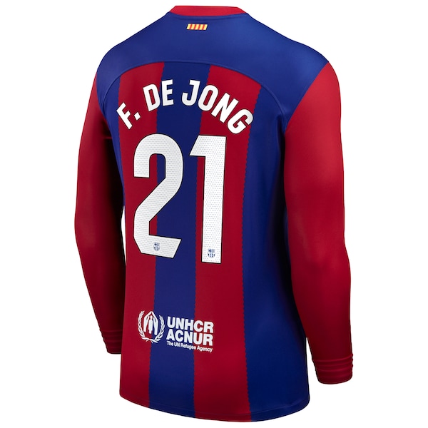 Look and feel like the real deal by adding this Frenkie de Jong 2023/24 Replica Long Sleeve Jersey to your game day wardrobe. This Nike jersey features Dri-FIT technology that keeps you dry and comfortable for all 90 minutes of the match. Its iconic design and Barcelona graphics will have you feeling like you're part of the squad when the team takes the pitch on matchday.