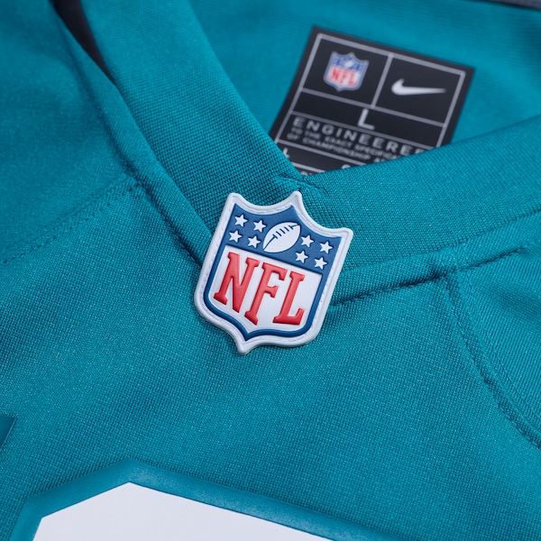 Channel your Jacksonville Jaguars spirit with this Josh Reynolds Team Game Jersey from Nike. This jersey is designed for movement and features mesh side panels for extra breathability. allowing you to stay cool and comfortable. The sewn-on NFL Shield at the collar and satin twill woven jock tag at the hem provide authentic finishing touches. while the heat-sealed name. numbers and team details showcase your Jacksonville Jaguars pride.