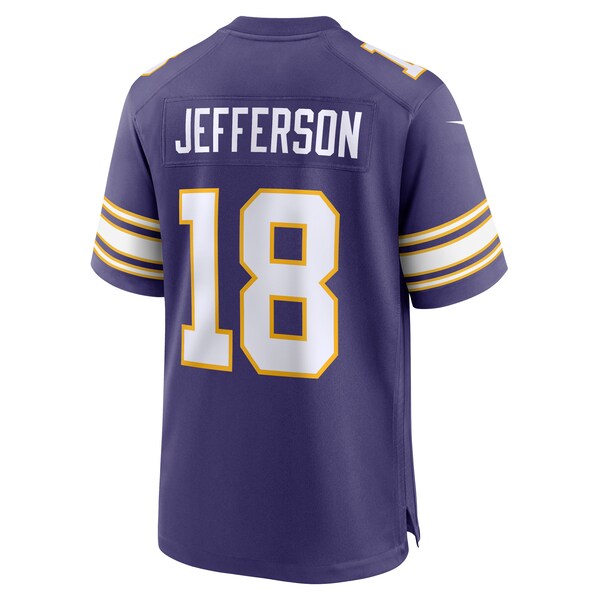 Honor the legacy of Fran Tarkenton and the Purple People Eaters with this throwback-inspired Minnesota Vikings Justin Jefferson Classic Player Game Jersey. This Nike gear features gold and white stripes on the sleeve and the gold trim around the numbers replicates the jerseys worn in the 1970s when the Purple People Eaters were wreaking havoc on opposing quarterbacks. The exciting graphics let you think back on the past while looking ahead to the next Minnesota Vikings season.
