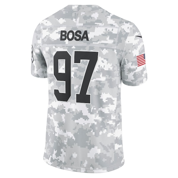 This Nick Bosa Salute to Service Limited Jersey delivers an authentic touch on game day with premium twill team appliques and a tribute to those who serve their country. Its special design is dedicated to the NFL's charitable initiative and features an allover arctic camo pattern and military-inspired details. Double pique fabric and sweat-wicking Dri-FIT technology provide consistent comfort as you represent the San Francisco 49ers and active or retired service members. The NFL does not profit from the sale of Salute to Service products. Charitable contributions are awarded by the NFL Foundation to the NFL's military partners. For more information. please visit www.NFL.com/Salute.