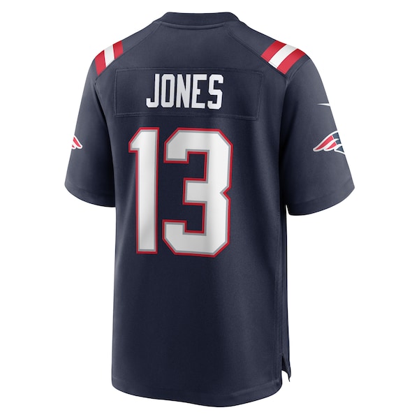 Rep the on-field look of your favorite New England Patriots player with this Jack Jones Game jersey from Nike. Its heat-sealed name. numbers and team details provide a kickoff-ready aesthetic while also offering a comfortable. lightweight feel. Designed for everyday movement. this jersey has a versatile tailored fit and features mesh side panels for added ventilation as you celebrate every big play by the New England Patriots this season.