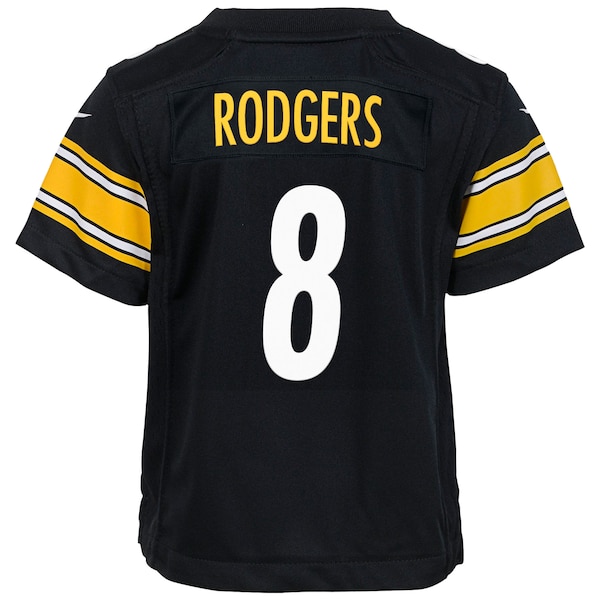 Let your young fan showcase their enthusiasm for their favorite team with this Aaron Rodgers Pittsburgh Steelers Game Jersey from Nike. Mesh side panels provide extra breathability. while the loose fit is designed for easy movement. making this jersey perfect for active young fans. Complete with screen print name. numbers. and team details. this jersey proudly displays your kiddo's unwavering support for the Steelers and Aaron Rodgers.